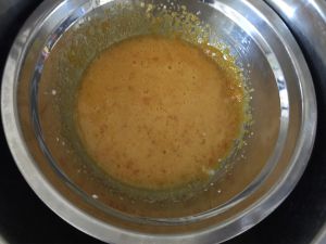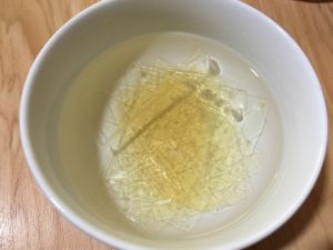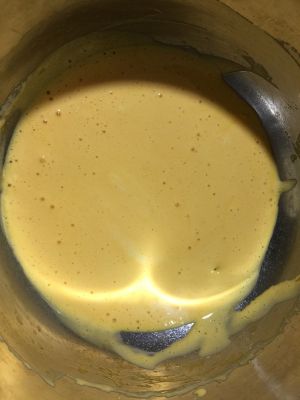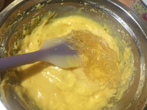 隔水融化吉利丁片。加入蛋黄糊中,打匀。