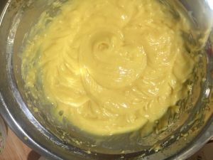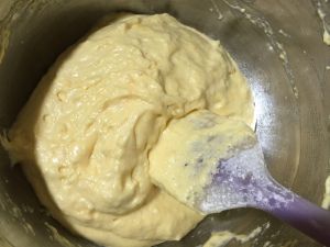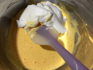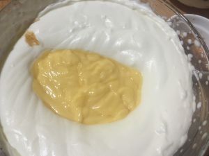 马斯卡蓬芝士打发顺滑。加入蛋黄糊搅拌均匀。