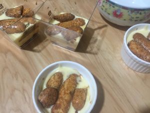 倒入一半时再铺上一层手指饼干并刷上咖啡朗姆酒液。