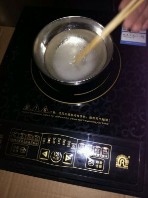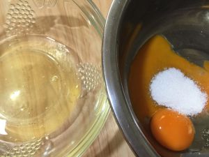 蛋黄搅打均匀,60g糖和60g水用小火煮沸保持沸腾状态10秒后倒入蛋黄中,边倒边快速搅拌。要注意让糖水呈图中所示呈直线细流状态倒入蛋黃,因为我们要的不是蛋花汤。