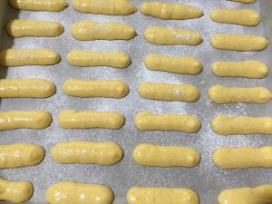 做好的面糊装入裱花袋,剪小口,或装入原型裱花嘴,挤入烤盘,挤出小长条形,放入预热好的烤箱,中层上下火160度烤20分钟即可