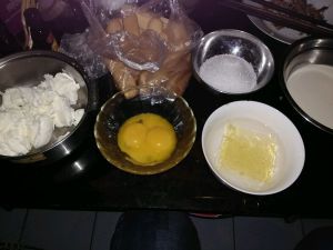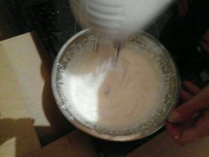 打蛋清,蓬松起沫后加2大勺糖,打出奶油装后,再兑入125克的mascarpone.打均匀。再用一样的方法打蛋黄酱。