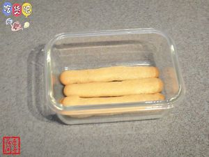 手指饼干在咖啡酒里迅速泡一下取出,放进容器中
