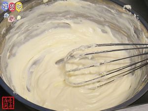 第四步将冷却的蛋黄液和吉利丁水一同倒入马斯卡彭芝士里一同搅拌,搅拌要z字搅拌,搅拌均匀待用
