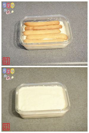 然后铺上一层奶酪糊,再铺上一层蘸了咖啡酒的手指饼干,再来一层奶酪糊,直到容器满了为止,最上层必须是奶酪糊。