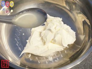 吉利丁沥干再隔水加热至50℃融化,即可加入糖水拌匀,再加入马士卡彭起司拌匀。