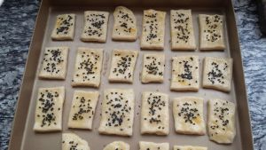 糖粉,盐导入色拉油,搅拌均匀。鸡蛋打碎到放色拉油的碗里,搅拌均匀。搅拌好导入低筋面粉,混合。烤箱165度预热,烤盘铺锡箔纸,搅拌好的面糊导入烤盘,铺平铺均匀,均匀撒上芝麻,入烤箱。上下火中层165度10分钟。