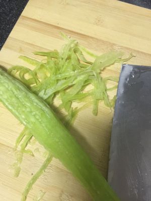 照这个方法把苦瓜表层的肉削下来,尽量不要削到瓤,但也要削干净,避免浪费。削下来的瓜肉切碎。