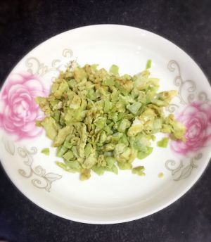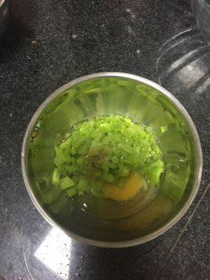 切好的苦瓜丁放碗里,碗里加鸡蛋,盐胡椒粉