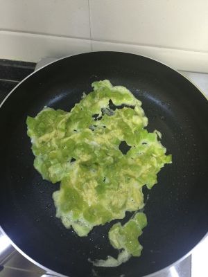 锅下适量油,倒入拌匀的苦瓜蛋汁,中火慢慢翻炒。