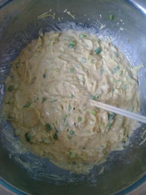 再加入鸡蛋,搅拌成金黄色的糊状,待用
