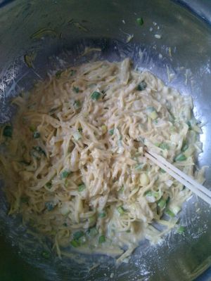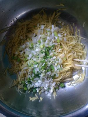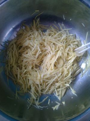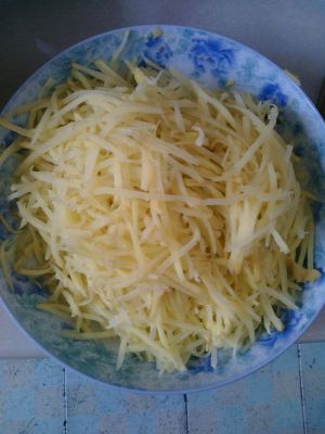 土豆去皮洗净,擦丝,加入适量面粉 ,十三香 ,盐,味精,适量水调成糊状。图的稀了,我后又加了一个土豆。