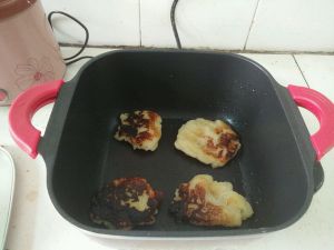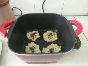 用手压成饼,放进油锅里,小火煎。由于,土豆泥很黏,手上要刷油,在饼上放着黑芝麻,可以移动时就是一面煎好了!