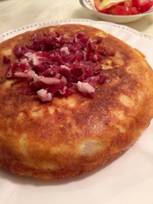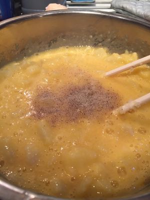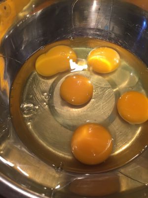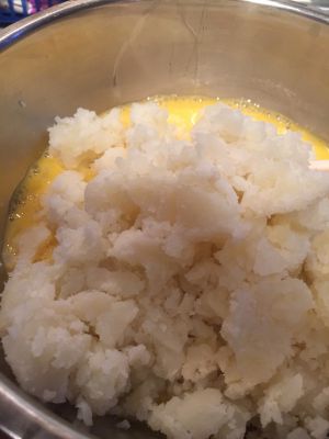 把土豆捣碎,但要留一些小块,和蛋液拌在一起。