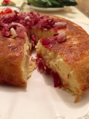 起锅,用勺子把面泥倾入,用油煎至熟透