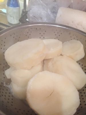 第一步就是土豆三个蒸熟啦,我用的是压力锅啦,无压力的十分钟就蒸好啦