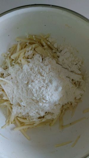 加入面粉,拌匀直到面粉能把根根土豆丝黏在一起。