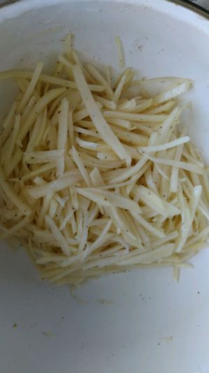 土豆切丝,加入适量盐,胡椒粉拌匀。