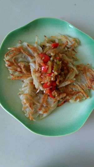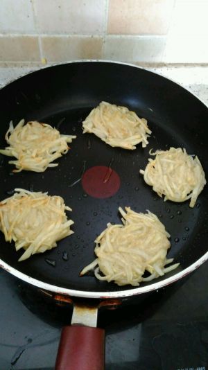 锅内加少许油,呆至冒烟,用勺子盛放土豆丝成圆形状入锅內。待可以晃动土豆饼再翻面,煎至金黄色即可。
