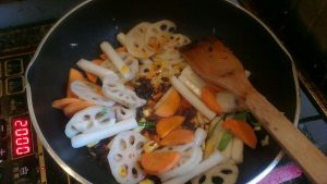 将焯水的蔬菜倒入锅中翻炒,最后放白菜叶,根据口味倒入酱油、蚝油、盐、翻炒均匀后关火;