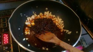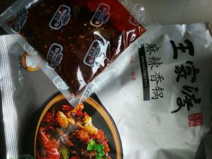 锅内放油,油温在五成热时,放入麻辣香锅料,我放入一包,因为食材多些。口感重的,可以多放些。