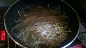 锅里水不用倒掉,可以把宽粉和豆芽也过一遍热水,(如果你家宽粉不宜煮烂,那就把宽粉和豆角,花菜一起煮)