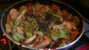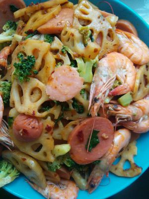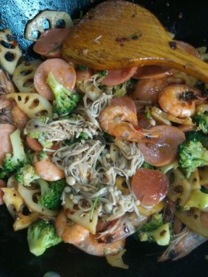 先放莲藕,西兰花,QQ肠翻炒,后放大虾,金针菇,香菜,翻炒大概四五分钟左右,调料均衡,就可出锅。