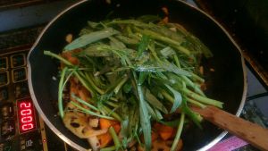 年糕,胡萝卜炒透之后把空心菜放入,进行翻炒