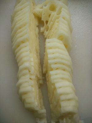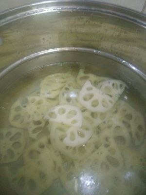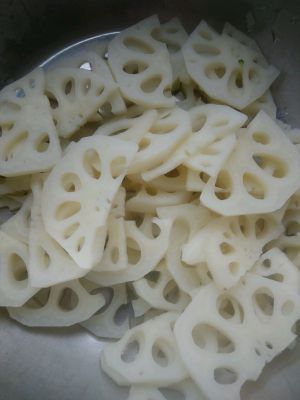 莲藕去皮,切片,如图。我把整片切开,不然,莲藕片太大了。