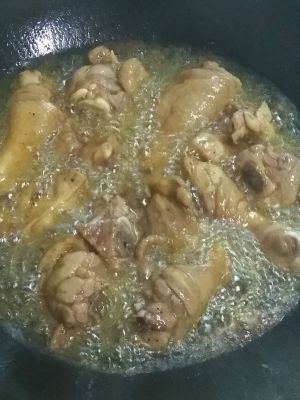 鸡腿上油锅炸一下,把腌出来的汁水倒掉,再下锅,以防油溅。大火炸等鸡肉变色再小火5分钟即可,捞出鸡肉,放人虾过油变色即可,剩下的油把土豆和藕也过一下油