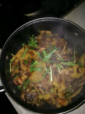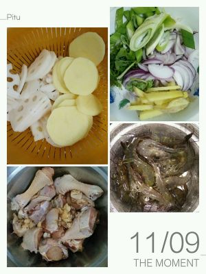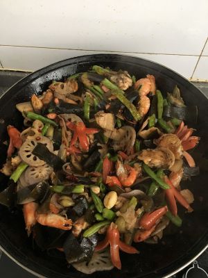 调料超出香味时,加进鸡块和虾炒炒,等入味最后放人藕和土豆