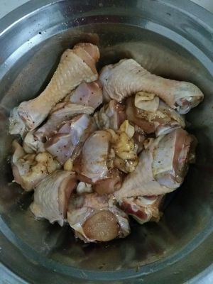 鸡腿剁成块,用生抽黑胡椒料酒先淹一会儿大概十几分钟的样子