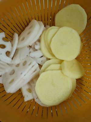 食材进行预处理:土豆片和藕片下锅炸至八分熟。最好不要水煮,水煮容易烂。
