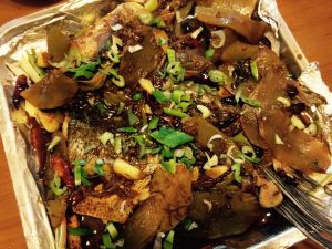 烤箱里的鱼烤好了,端出来,把刚刚做好的炒料浇上去,撒上葱花,收工
