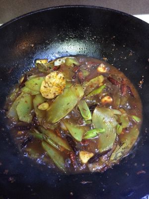 放入油,中火煸炒辣椒,然后依自己口味,把火锅底料切半块放入,放入桂皮,香叶,一大把花椒,最后把配菜莴笋放入一并翻炒。