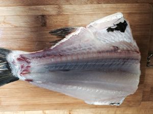 把鱼处理洗净,放在案板上沿着鱼骨一剖两半。