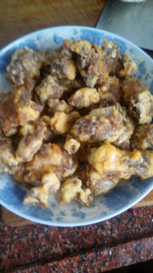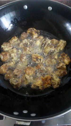 下油锅,油多一些要能淹过排骨。待其热。一块一块放入排骨,炸1 2分钟每块翻一面。同样炸1 2分钟。再翻面再炸,再翻面再炸。炸至金黄,捞起晾干油