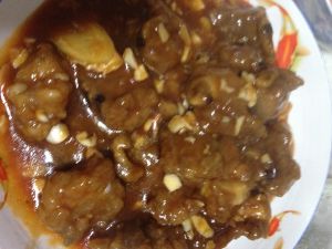 拿一个新碗,将地瓜粉倒一点点下去,加少量清水,搅拌均匀,备用。拿一个新碗,在碗内加入盐,胡椒粉,酱油,醋,糖,还有番茄酱(材料那边忘记写了,这是重点哦,一定记得。)把这些调匀。重新起锅,锅内加少量油。待其热,将这一碗自制调酱倒入,翻炒一会加入清水,搅匀再放入炸好的排骨。不断翻炒,再加入蒜末。再加少量醋。再倒入备用的地瓜粉水,勾芡。等到酱汁变稠时即可起锅装盘食用。