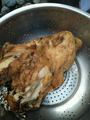 等石头烧红以后把全鸡放上去,石头的温度可以把全鸡底部蒸熟