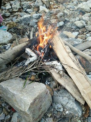 烧柴火,柴下面放几个石头