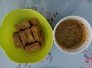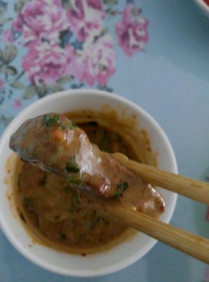 准备沾料,取一块王致和臭豆腐不要汤汁,碾压碎后加一小勺芝麻酱,倒入一点海鲜酱油,葱切碎,蒜拍成蒜泥点,加入点凉白开水搅拌,成糊状再次加点水继续搅拌