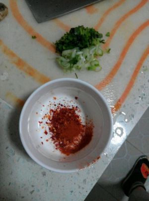 热油的同时把辣椒面和辣椒粉放在碗里面,切好葱花末和香菜末。