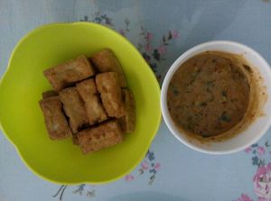 第一步先把豆腐用水洗一下然后切块,我切的长条(切什么样的形状随意)待用。