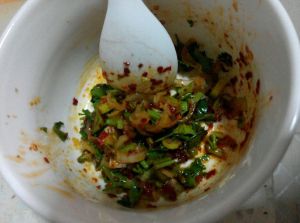 炸完豆腐的油在稍微一热,用一点油浇在辣椒面上然后放入葱花和香菜拌匀。(油不用太多怕太腻)