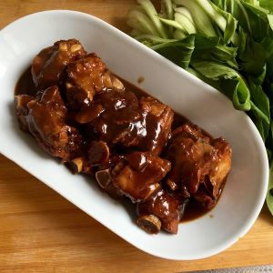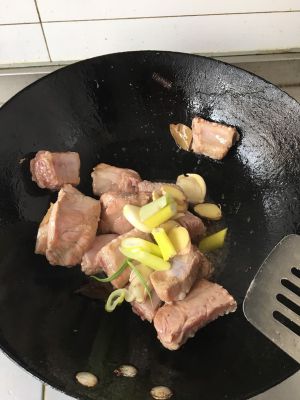 锅里放少许油爆香姜和大蒜,放入排骨一起翻炒,待排骨表面金黄即可(时间不宜太久否则排骨会变硬)再倒入调好的酱料继续翻炒片刻,最后加入清水(漫过排骨)
