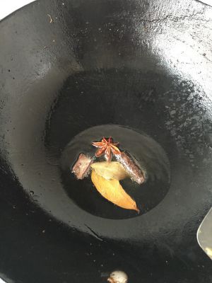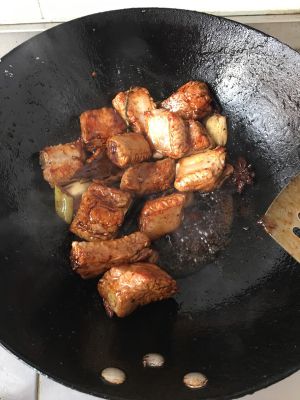 炒至两面微焦放入适量生抽,老抽,白糖,米醋微炒。放入开水,中小火,盖上锅盖焖制。几分钟后翻炒,放少许盐,继续焖制。