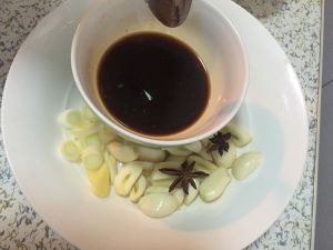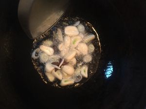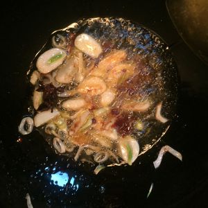 把蒜,大料葱姜放入八成熟的油锅中炒出香味