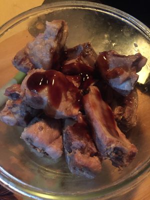 用水煮熟的排骨用料酒还有蚝油腌制(用水煮之前用冷水浸泡排除血水,水煮时里面放香叶葱段姜片大料)