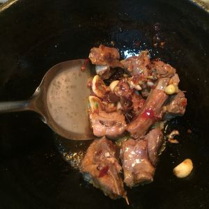 热锅,放少量油,切好姜蒜放入炸香,把排骨放入锅中,翻炒一小会儿,把事先调好的酱汁倒进去,翻炒。