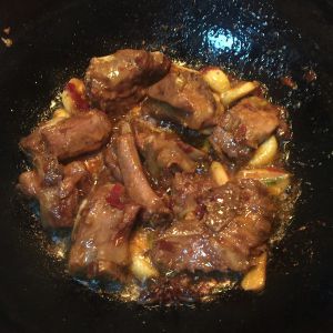 6.加入排骨翻炒,加米酒,生抽,开水,大火煮开,小火煮20分钟;再加醋翻炒